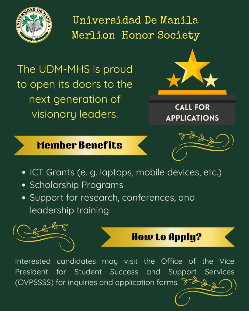 The Universidad De Manila Merlion Honor Society (UDM-MHS) is proud to open its doors to...