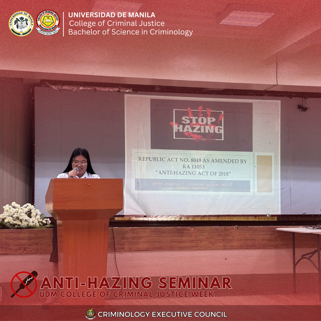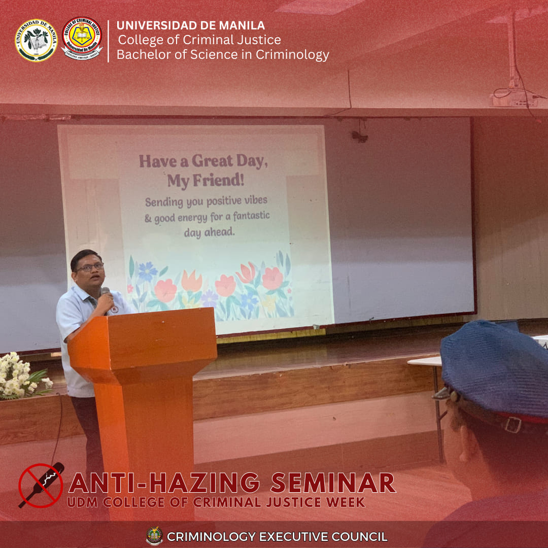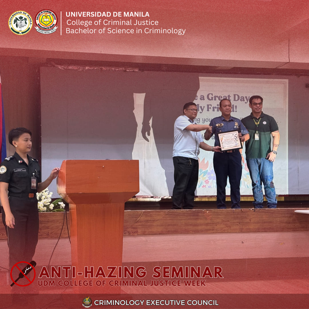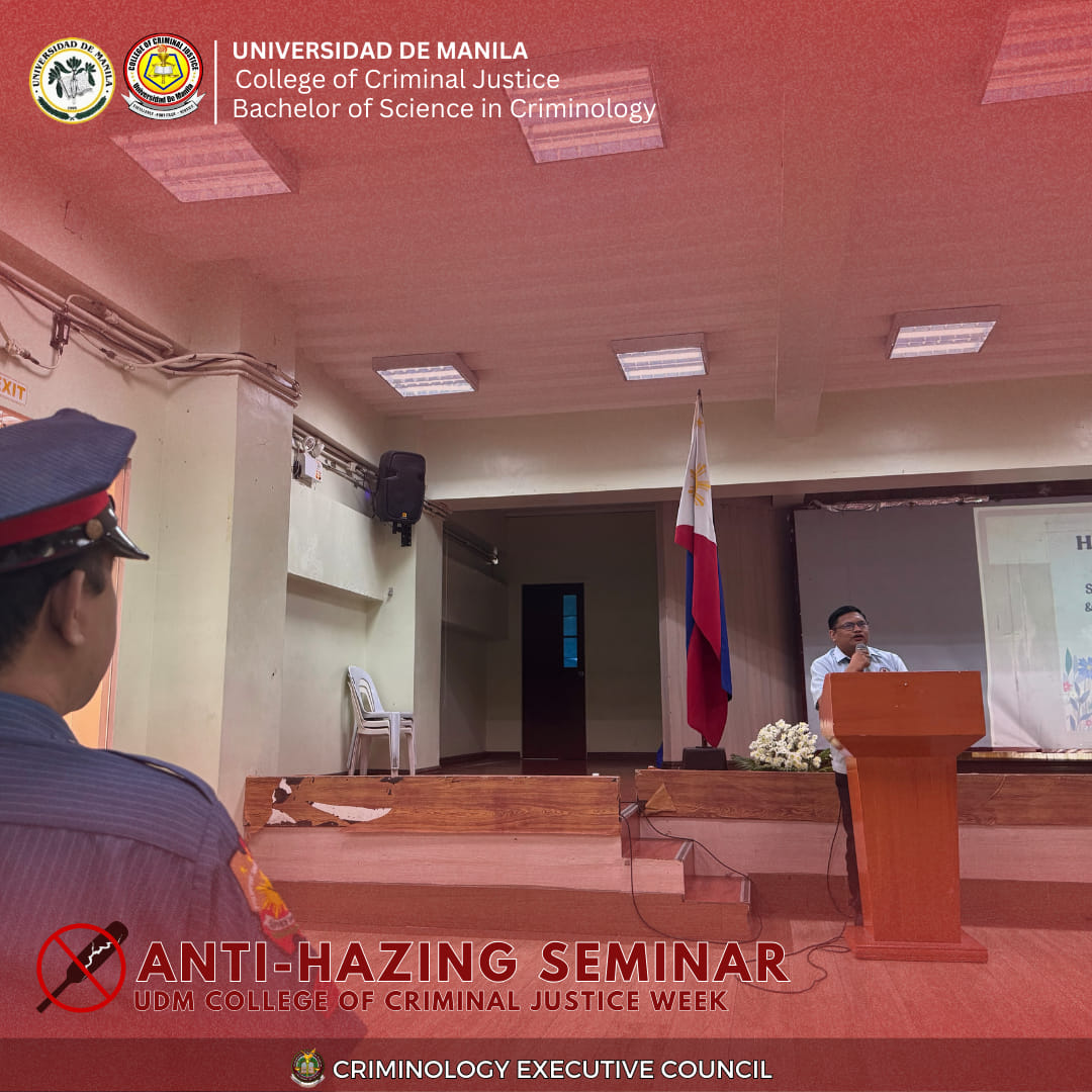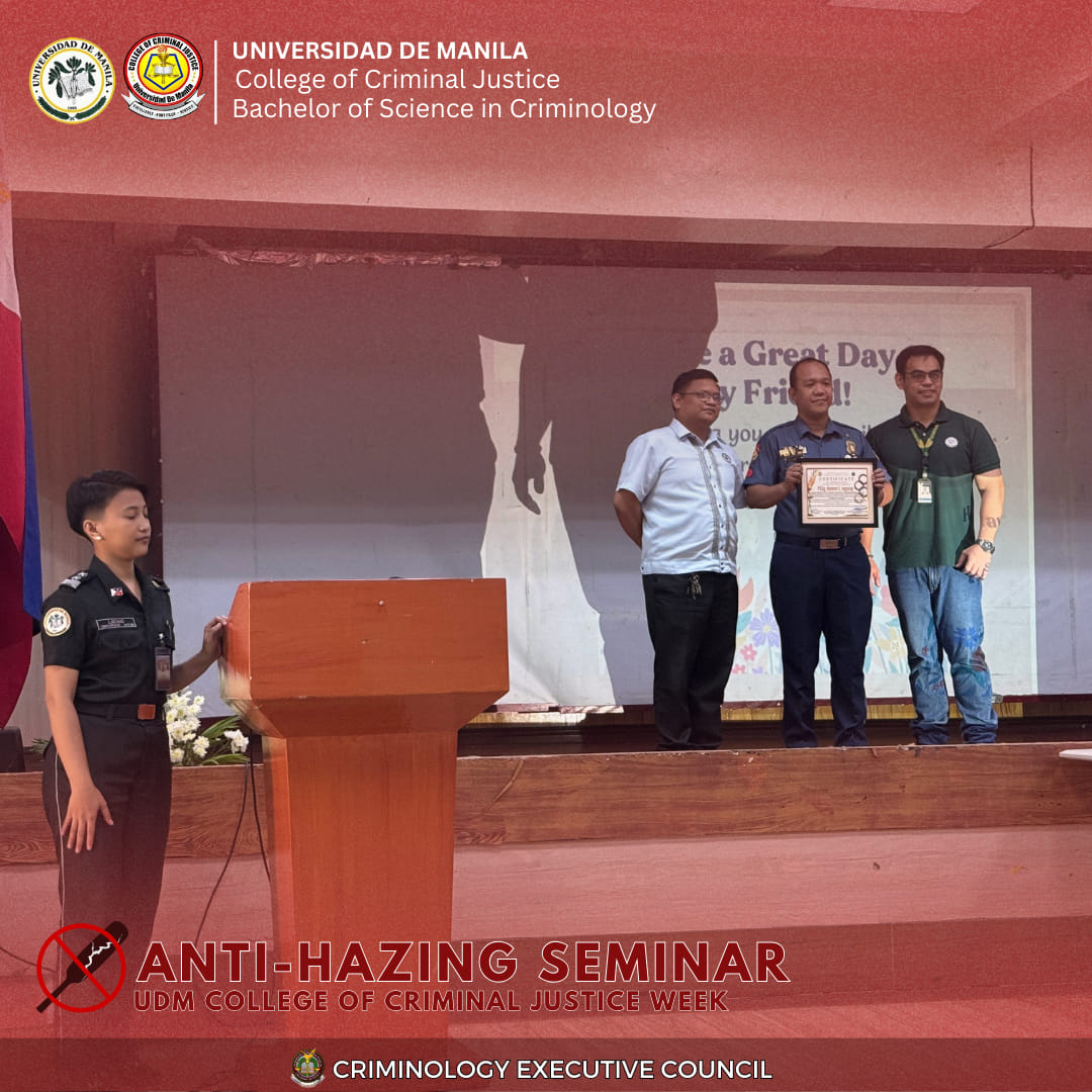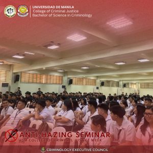As part of the College of Criminal Justice (CCJ) Week, the Universidad de Manila (UDM) conducted an Anti-Hazing Seminar in September 2025 at the College of Criminal Justice, reinforcing the University’s commitment to cultivating responsible and ethical criminologists. The event brought together faculty members, students, and local partners to raise awareness of the legal, moral, and social consequences of hazing—while honoring those who have suffered from such acts.